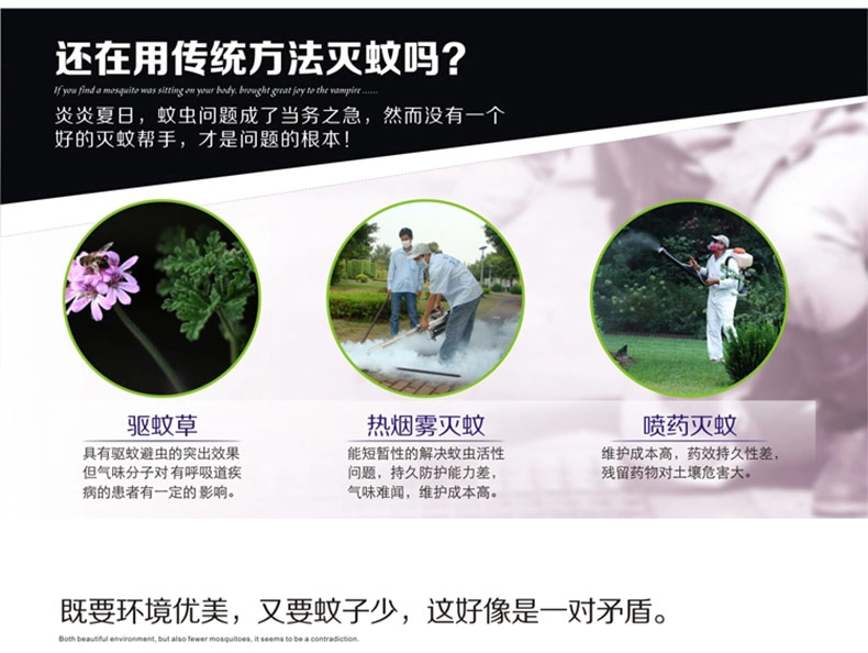 1、冷陰極燈管誘蚊效果,紫外線(xiàn)誘蚊,高壓電網(wǎng)殺蚊,物理方式滅蚊,環(huán)保無(wú)污染。